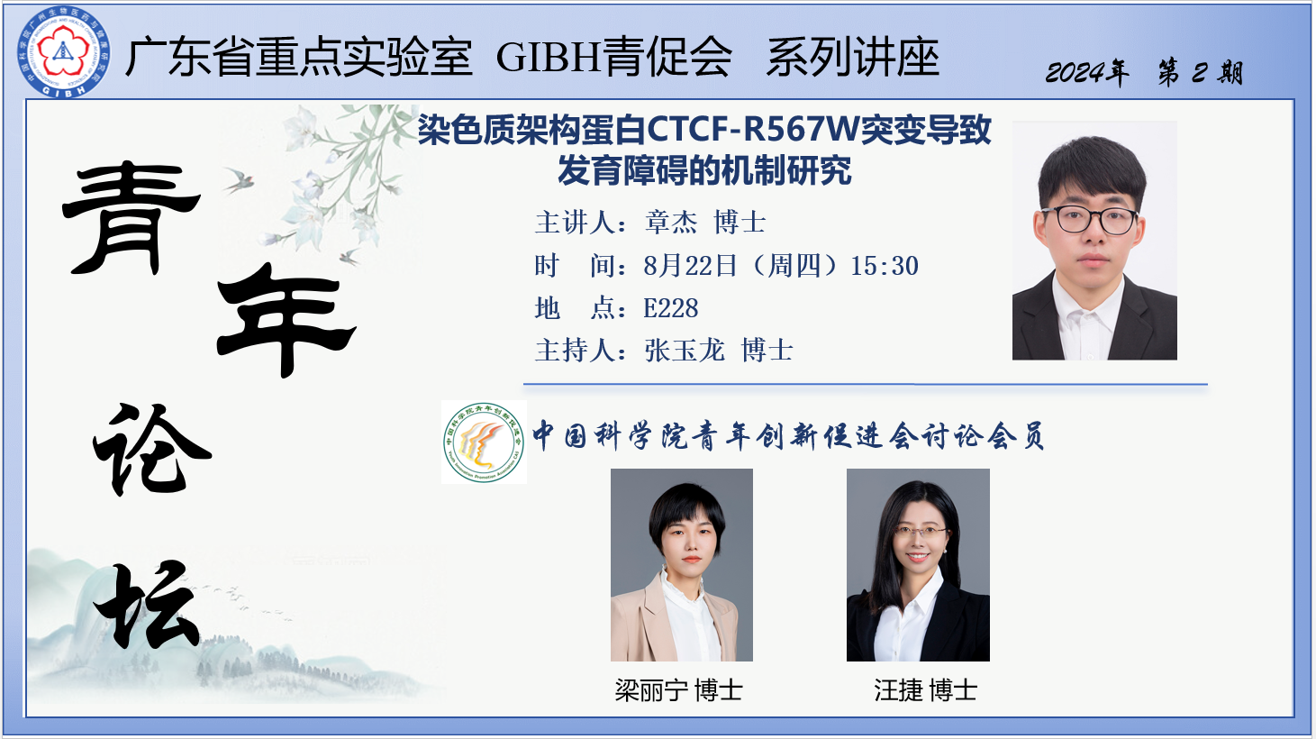 2024年8月22日廣東省重點實驗室GIBH青促會系列講座(2024年第2期):染色質架構蛋白CTCF-R567W突變導致發育障礙的機制研究