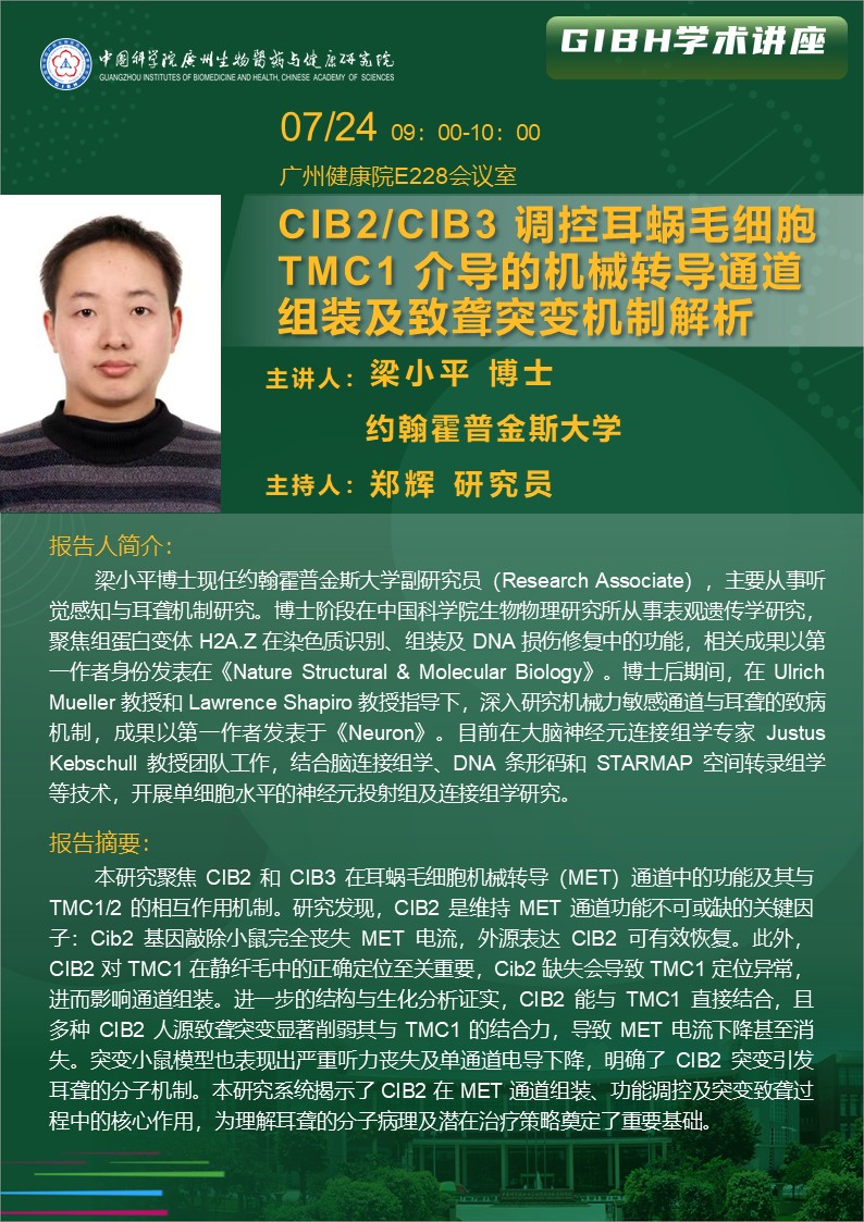 2025年7月24日講座: CIB2/CIB3 調控耳蝸毛細胞 TMC1 介導的機械轉導通道組裝及致聾突變機制解析